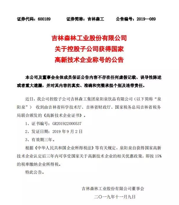 ? ? ? 根據科學技術廳、吉林省財政廳、國家稅務總局聯合頒布的《關于公布吉林省2019年第一批國家高新技術企業認定結果的通知》,經過層層審核,吉林森工集團泉陽泉飲品有限公司由吉林省科學技術廳、吉林省財政廳、北京市國家稅務局、國家稅務總局吉林省稅務局局聯合批準下發的高新技術企業認定。